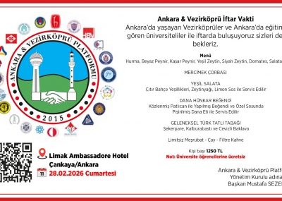 12 yıldır geleneksel olarak düzenlediğimiz Ankara'da eğitim gören Vezirköprülü Üniversiteli Öğrenciler ile Vezirköprülü bürokrat, siyasetçi, akademisyen, sporcu, işadamı, yazar, gazeteci, Sivil Toplum Örgütleri ve Ankara'da yaşayan Vezirköprülü aileler, Platform Yönetim Kurulu Üyelerimiz - aileleri ile iftar programımız bu sene 28 Şubat 2025 Cumartesi günü Limak Ambassadore Hotel'de ( Gaziosmanpaşa, Boğaz Sk. No:19 Çankaya / Ankara) düzenlenecektir.